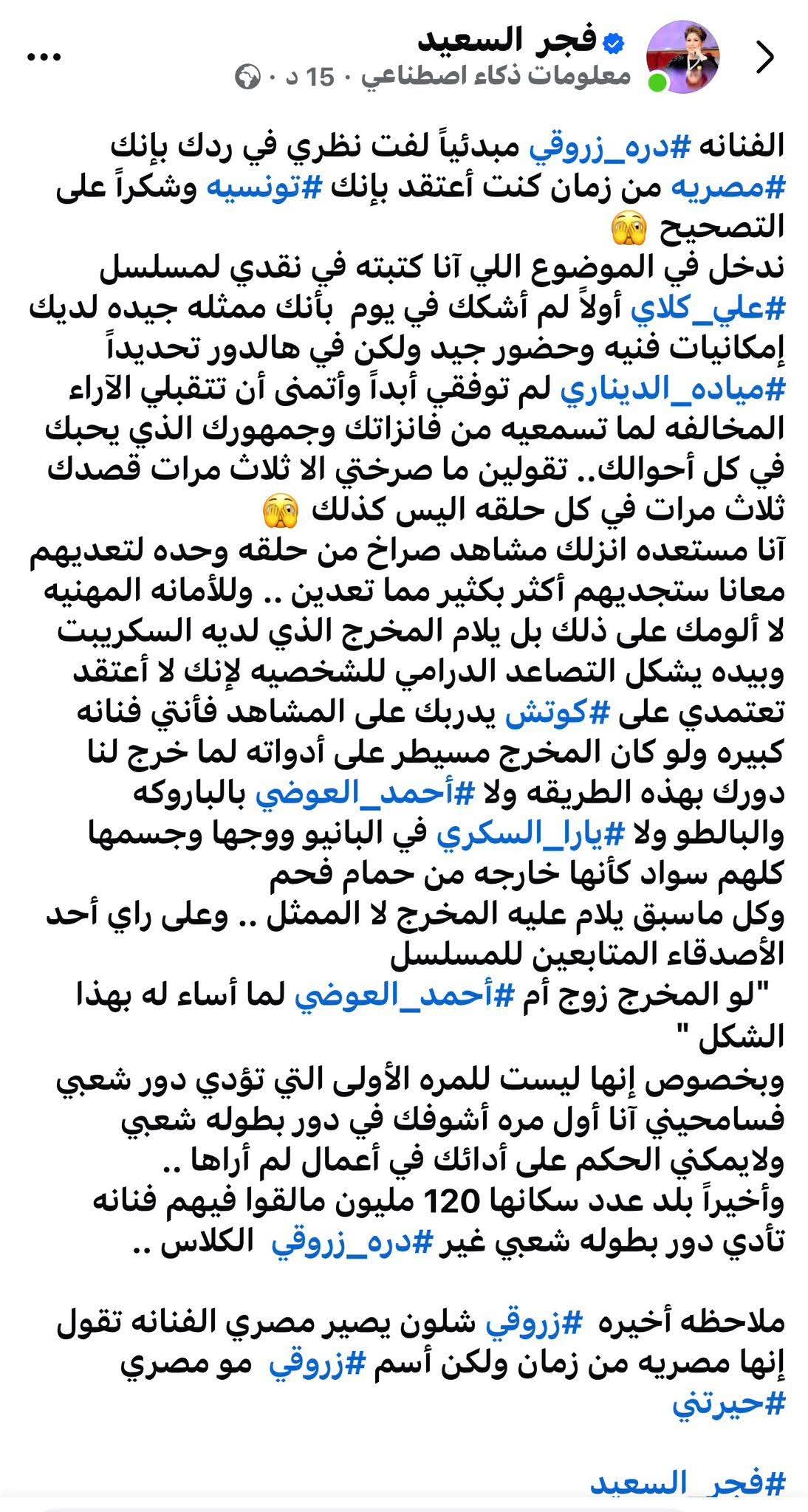 شنت الإعلامية والكاتبة الكويتية فجر السعيد هجوماً حاداً على الفنانة التونسية درة زروق، على خلفية دورها في مسلسل “علي كلاي”، موجهةً لها انتقادات لاذعة طالت أداءها التمثيلي وطبيعة الشخصية التي تقدمها.