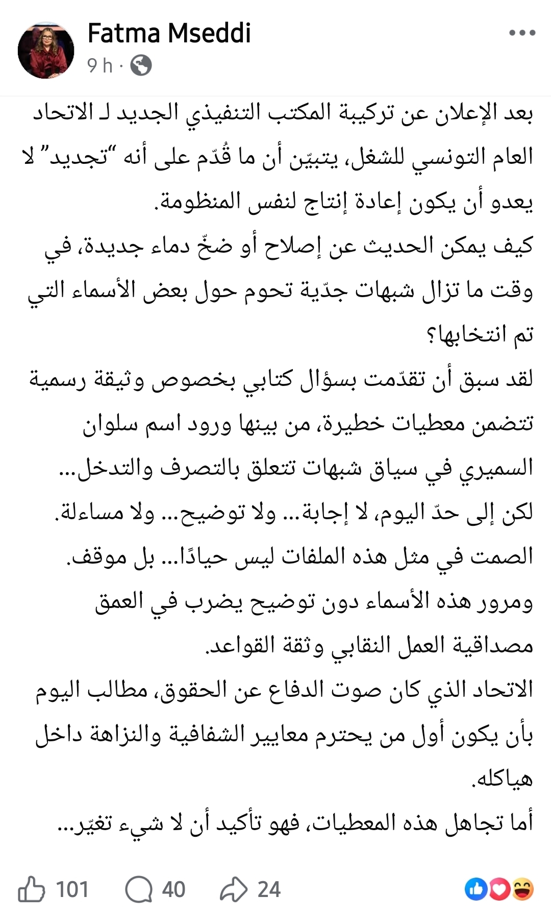 وتساءلت المسدي، في تدوينة نشرتها عبر حسابها الرسمي، عن كيفية الحديث عن ضخ دماء جديدة في المنظمة الشغيلة في ظل استمرار وجود أسماء تحوم حولها “شبهات جدية”.