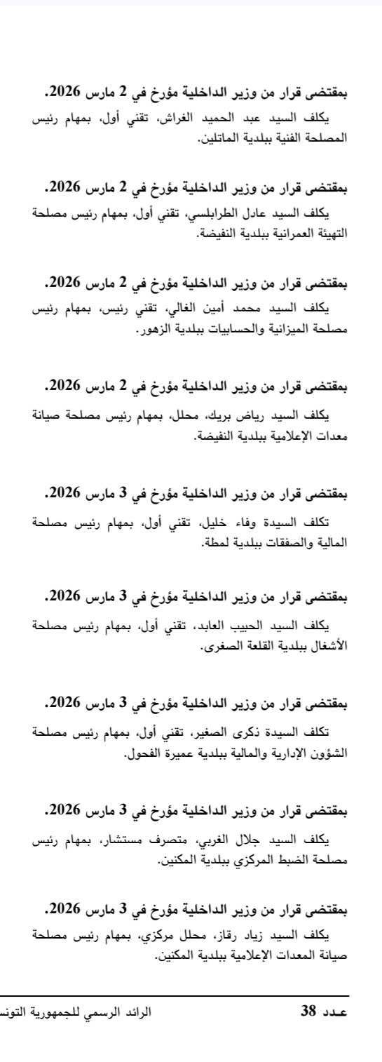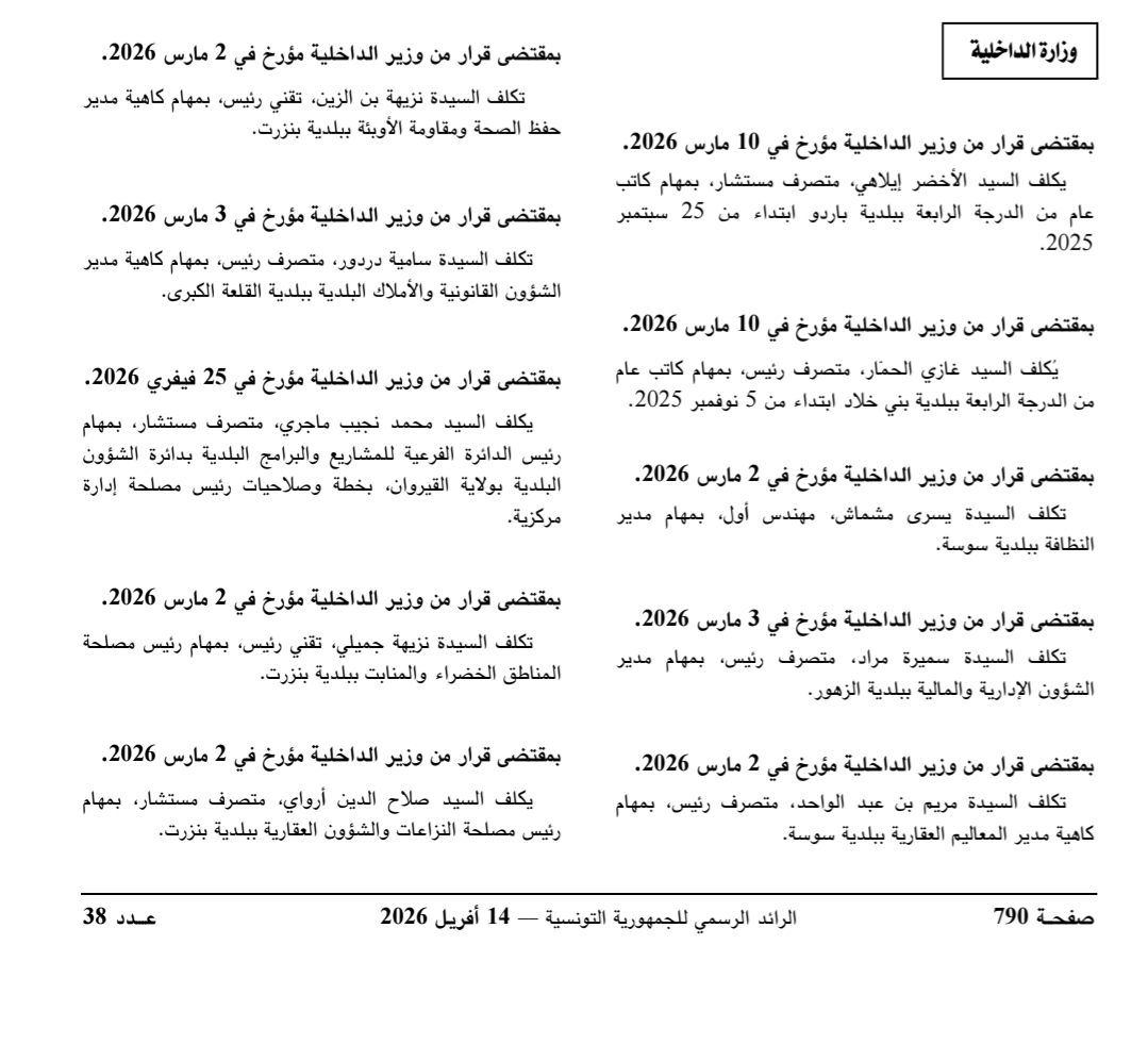 صدرت بالعدد الاخير للرائد الرسمي للجمهورية التونسية بتاريخ 14 أفريل 2026 تسميات جديدة صلب وزارة الداخلية وفي ما يلي التفاصيل..