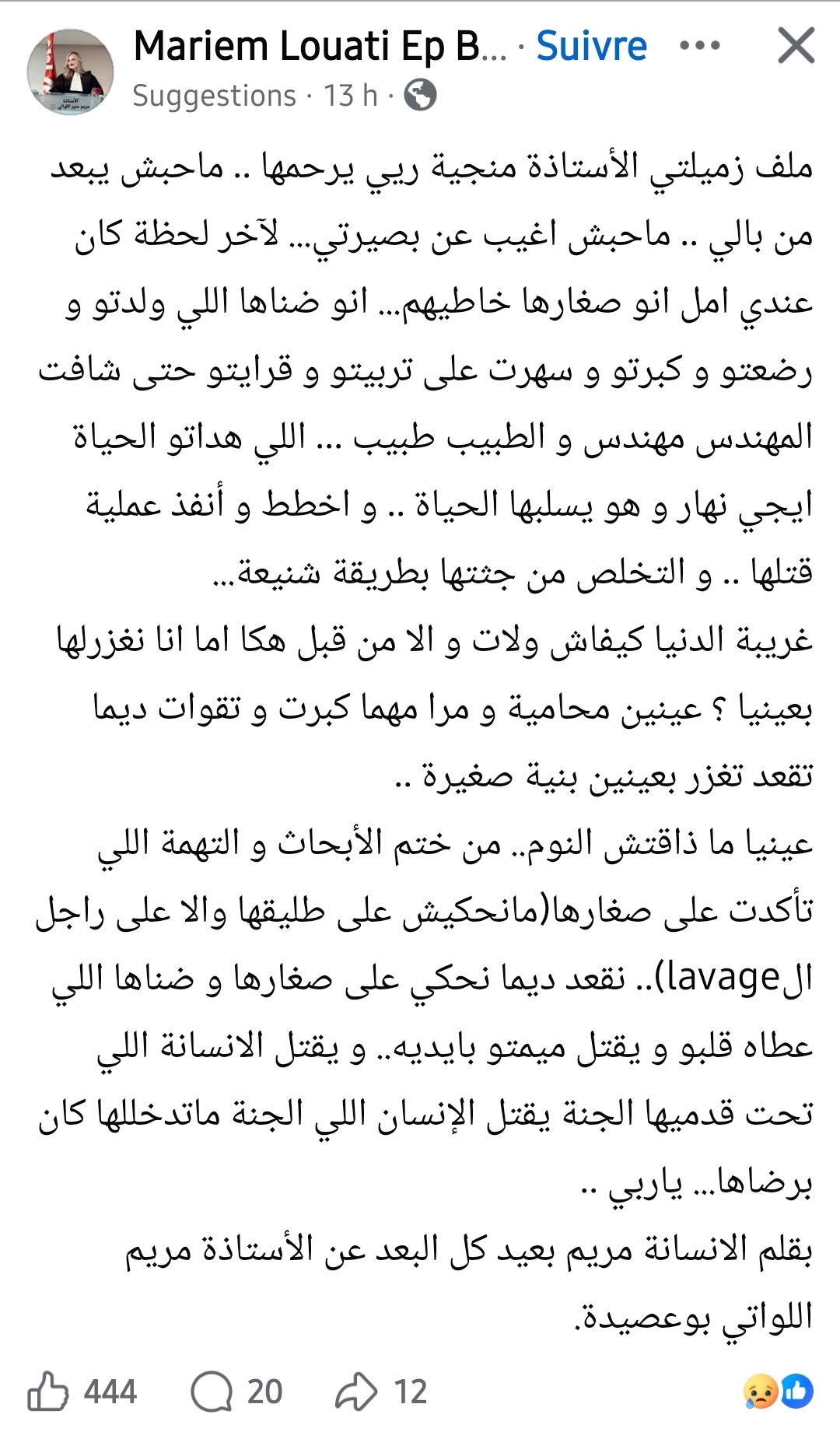 وبكلمات يملؤها الذهول والحسرة، عبّرت الأستاذة مريم في تدوينة نشرتها عبر حسابها الشخصي بالفيسبوك عن صدمتها التي لم تستطع تجاوزها، مؤكدة أن “ملف الزميلة الراحلة لا يغادر بصيرة عقلها”، خاصة بعد أن قطعت نتائج التحقيقات الشك باليقين بشأن هوية الجناة.