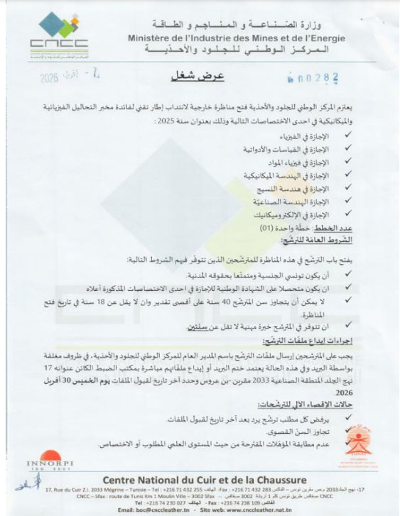 يعتزم المركز الوطني للجلود و الاحذية فتح مناظرة خارجية..