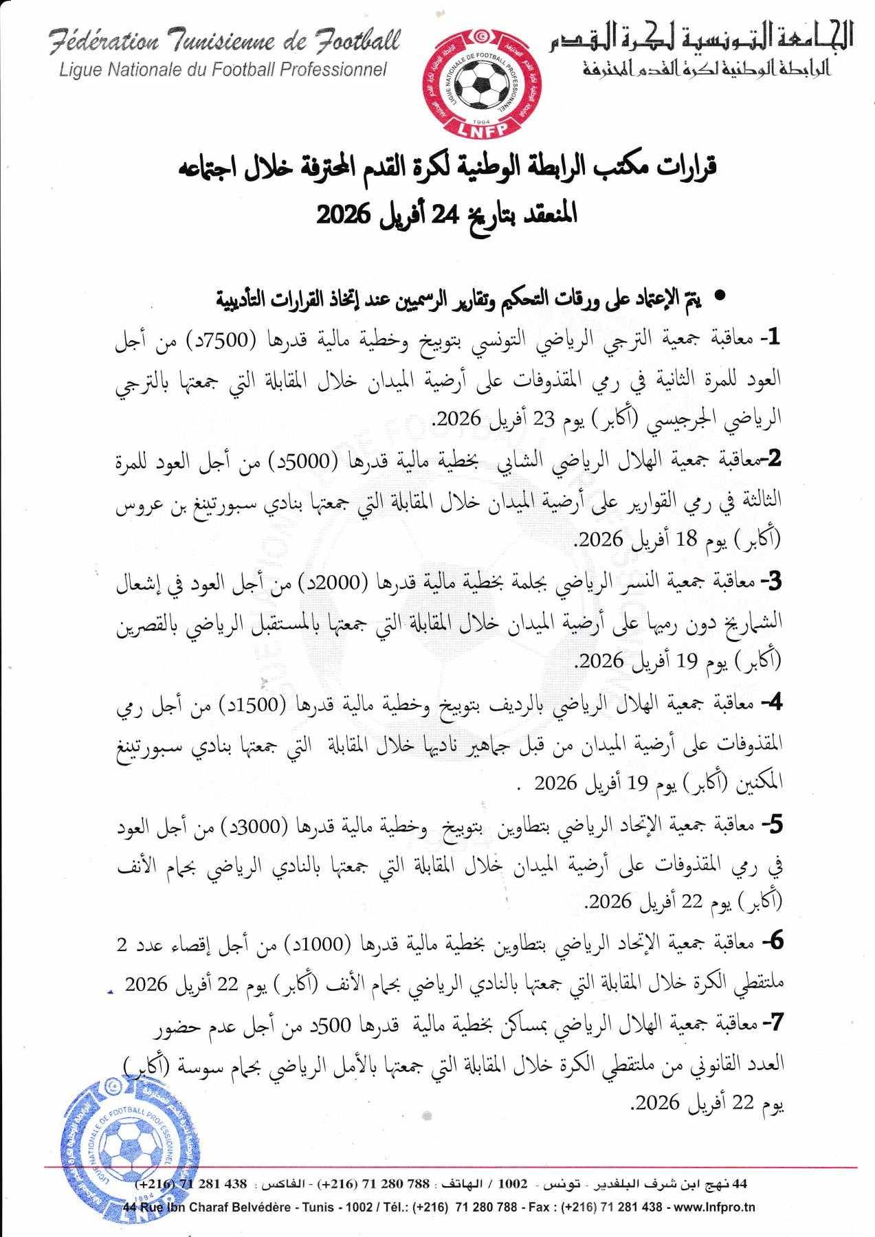 أعلن مكتب الرابطة الوطنية لكرة القدم المحترفة، في اجتماعه المنعقد يوم الجمعة 24 أفريل 2026، عن تسليط سلسلة من العقوبات التأديبية والمالية ضد عدد من أندية الرابطتين الأولى والثانية، وذلك بناءً على التقارير الرسمية المسجلة خلال الجولات الأخيرة من البطولة.